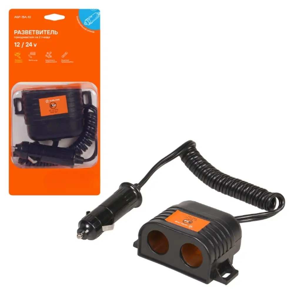 Разветвитель прикуривателя 2 гнезда 15А, витой шнур