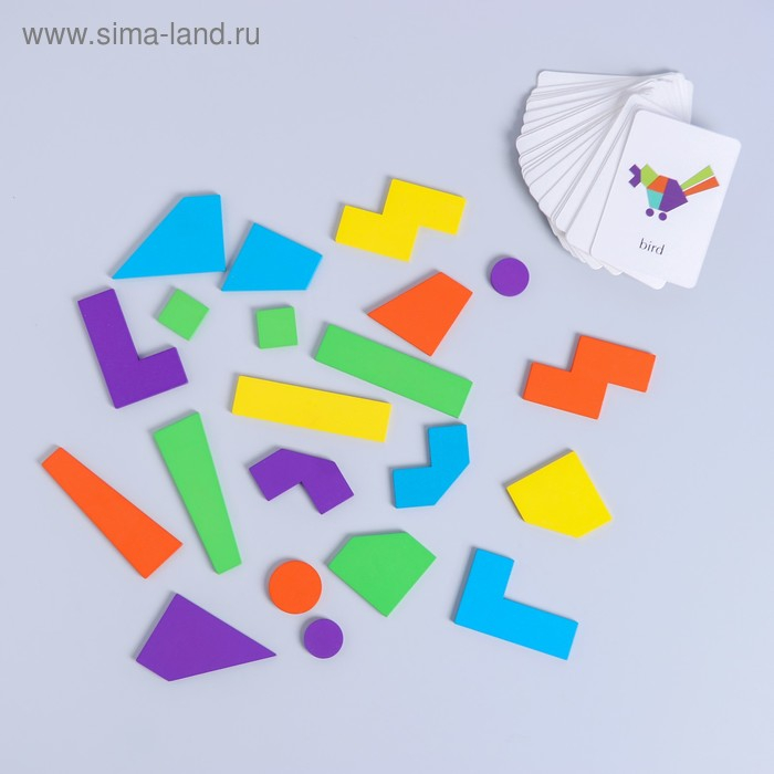 В наборе есть 25 карточек с примерами изображений, которые ребёнку предстоит составить из цветных деталей.