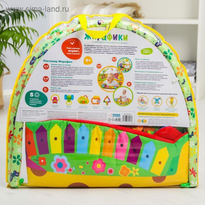 Когда кроха научится сидеть, можно снять дуги и использовать изделие как мягкую и тёплую подстилку для игр. Ростомер на коврике позволяет следить, как растет малыш.