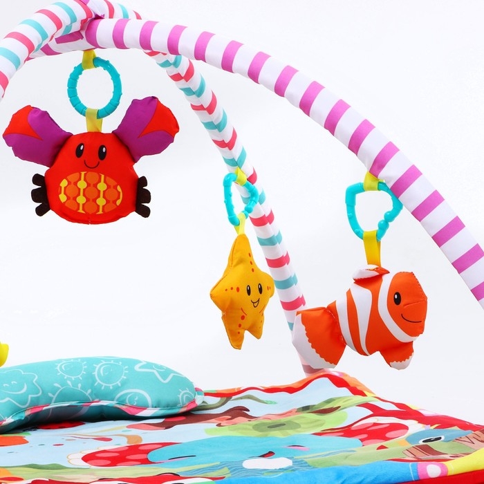 Малыш играет на спинке лёжа. На самом раннем этапе своего развития малыш тянется за яркими, притягивающими внимание игрушками и учится их хватать. В комплекте с ковриком прилагаются подвесные игрушки, яркие и привлекательные, они служат для развития тактильных ощущений и зрения.