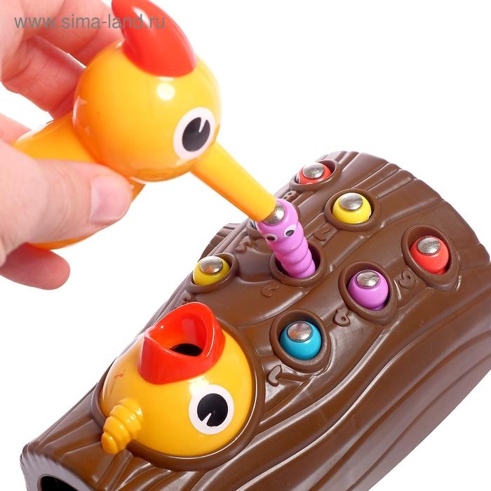 - Достаньте червячков из дерева с помощью магнитиков, расположенных на клюве дятла и самих червячках. Перенесите их в открытый рот птенчика.