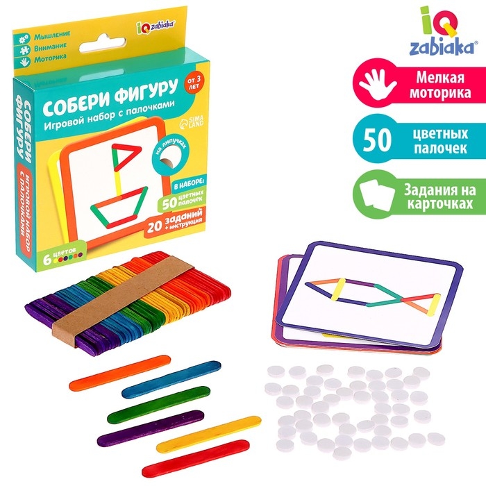 Обучающий набор «Собери фигуры» подходит для малышей от 3 лет. Он включает 50 цветных палочек и 20 заданий на карточках-схемах с инструкцией. Палочки выполнены из натурального дерева, приятны на ощупь и безопасны для ребёнка.