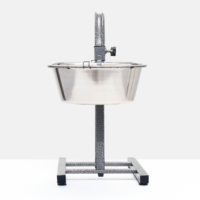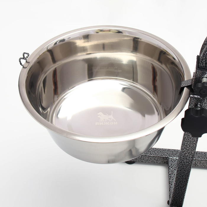 Конструкция позволяет регулировать высоту, обеспечивая удобство как для щенков, так и для взрослых собак крупных пород. Тяжелая и устойчивая опора предотвращает опрокидывание, а вместительные миски подходят для подачи как воды, так и корма.
