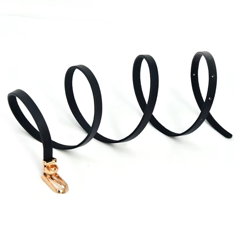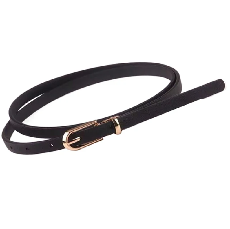 Этот изысканный тонкий черный ремень из эко-кожи станет идеальным акцентом для вашего платья. С его стильным дизайном и элегантной золотой пряжкой, он добавит нотку утонченности и завершенности любому образу.