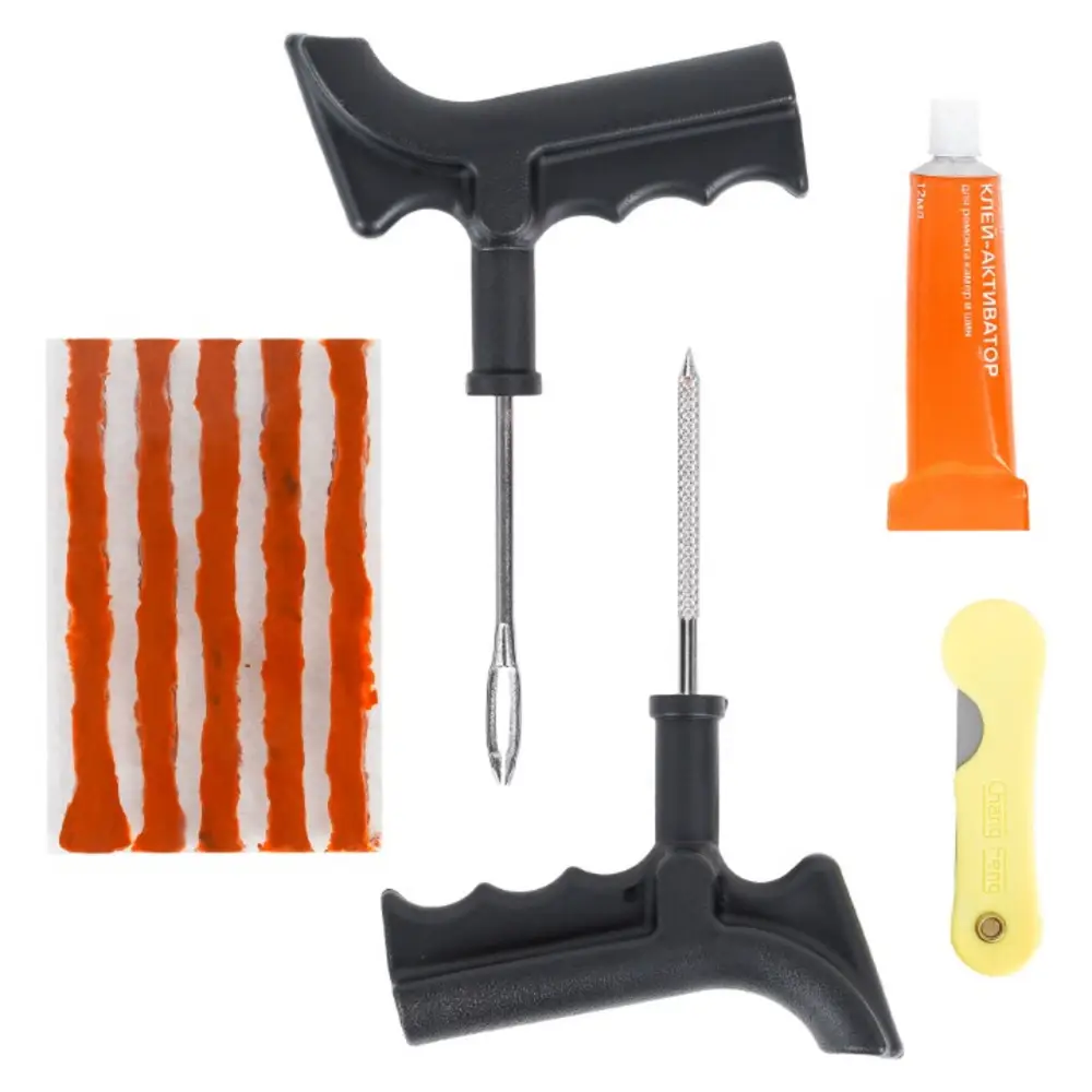 Ремонтный комплект поможет произвести экстренный ремонт шин. В наборе представлены инструменты шило-напильник и шило для установик жгута с игольчатым наконечником, а также 5 штук армированных жгутов сырой резины длиной 10 см. Набор является бюджетным вариантом оказания ремонтных услуг с базовым комплектом необходимых инструментов. С помощью инструмента шило-напильник зачищается место прокола. С помощью инструмента с игольчатым отверстием прокол заделывается жгутом из сырой резины. Пару минут ожидания и можно ехать!