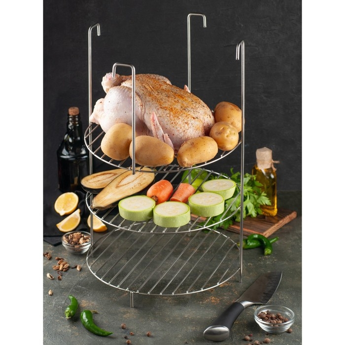 3-х ярусная решетка для тандыра – незаменимый аксессуар для приготовления блюд в тандыре. На этажерке удобно готовить рыбу, овощи, шашлык и многое другое.