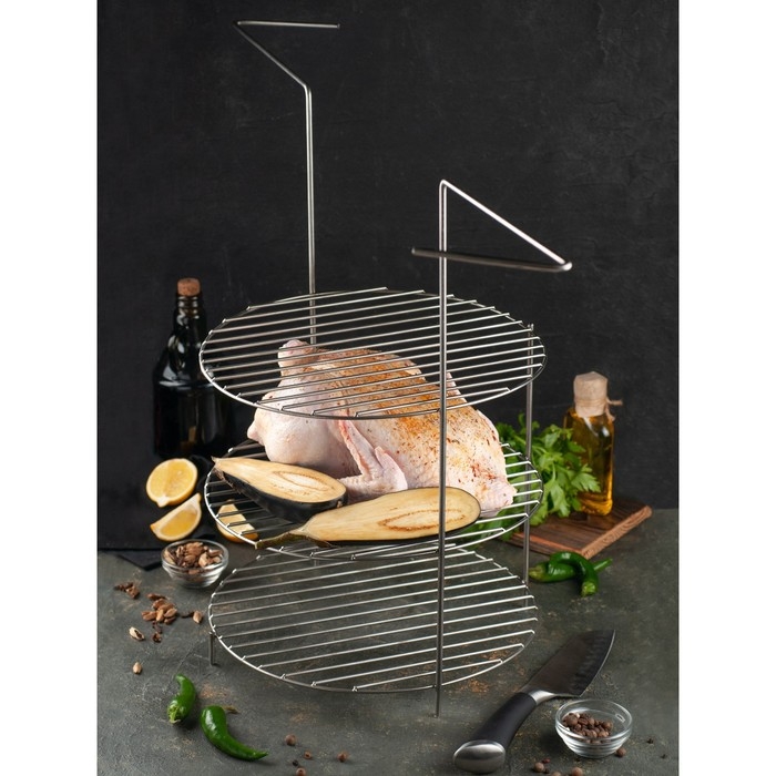 3-х ярусная решетка для тандыра – незаменимый аксессуар для приготовления блюд в тандыре. На этажерке удобно готовить рыбу, овощи, шашлык и многое другое.