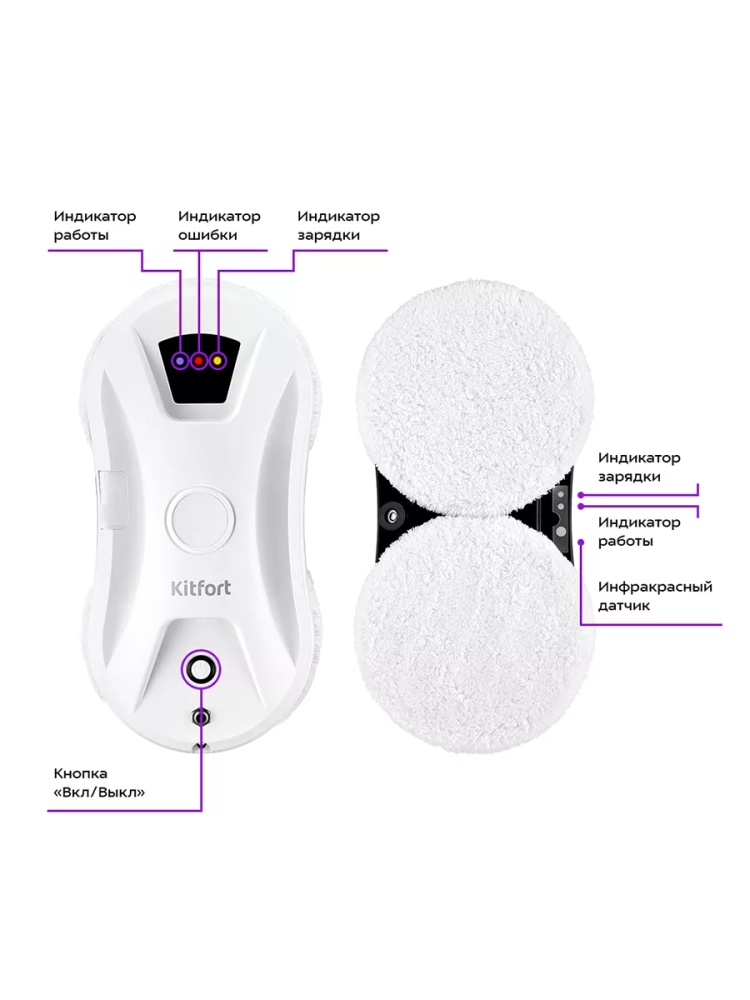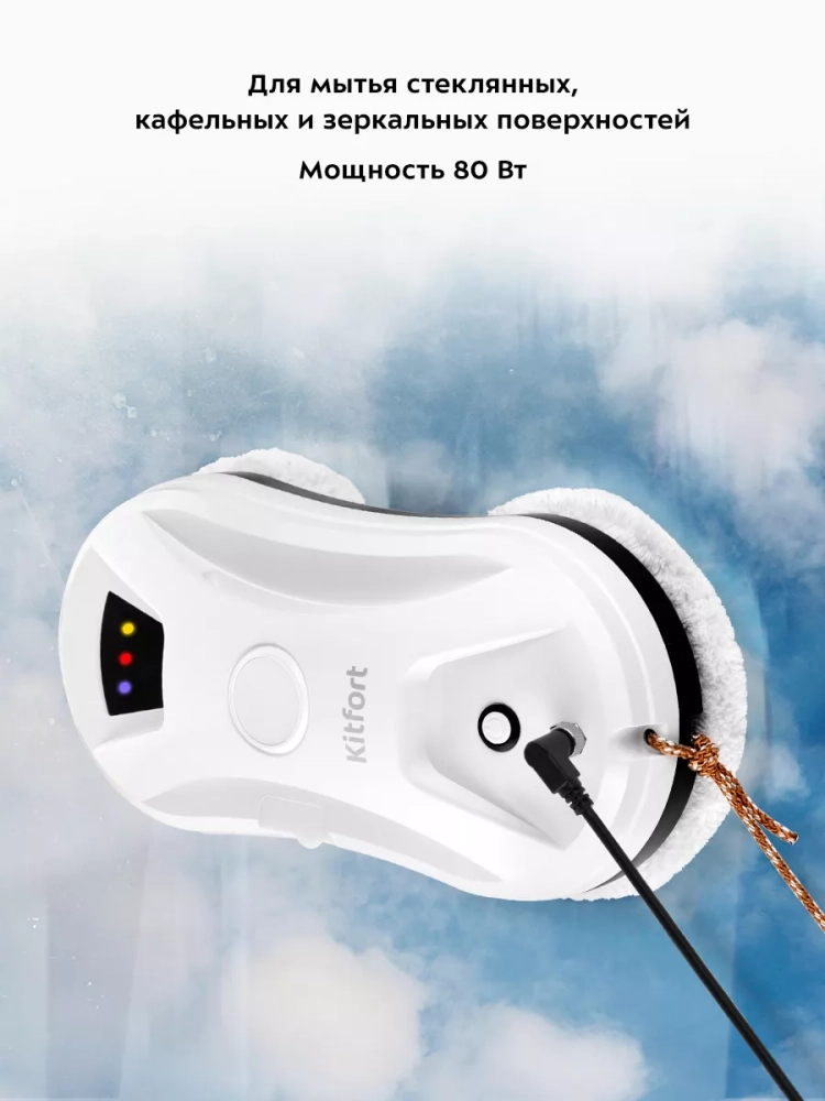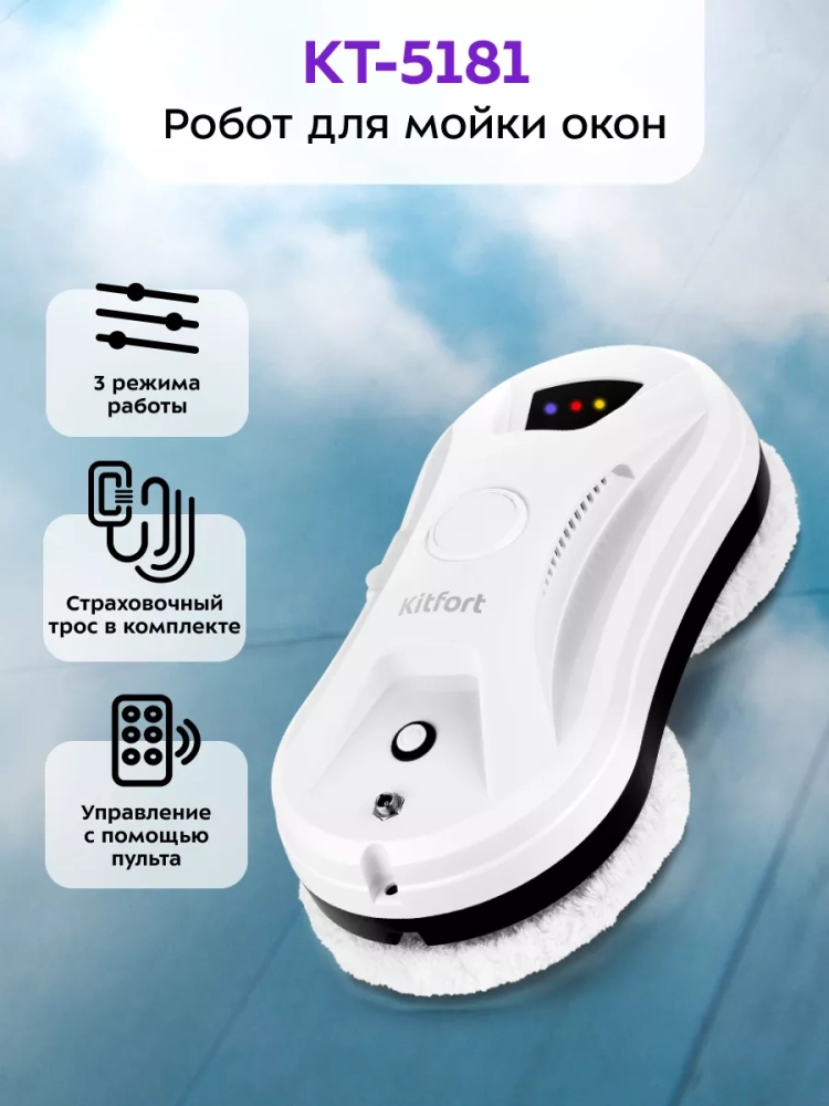 Робот Kitfort КТ-5181 предназначен для мытья стеклянных, кафельных и зеркальных поверхностей. Устройство оснащено вентилятором, который создает разрежение между дном робота и очищаемой поверхностью, благодаря чему робот удерживается на гладкой вертикальной поверхности. К двум держателям тряпок на дне робота крепятся чистящие тряпки, которые идут в комплекте. Тряпки оттирают и впитывают грязь. Прибор укомплектован страховочным тросом, поэтому вы можете использовать робот для высоких или широких окон. На случай внезапного отключения электричества робот снабжен резервной системой питания, которая будет удерживать робота на окне около 20 минут.