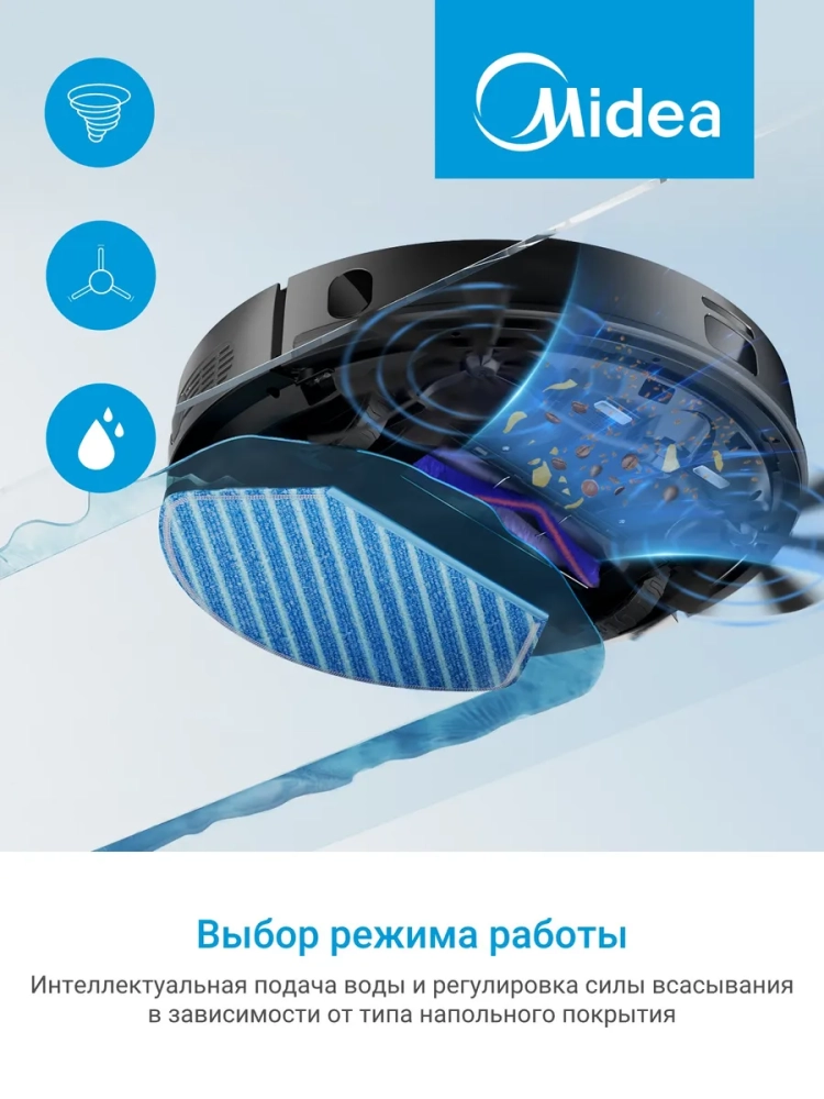 Midea VCR M7 EVO оснащен Wi-Fi модулем, который позволяет легко управлять устройством со смартфона или планшета. С помощью удобного мобильного приложения вы можете задавать четкие параметры уборки, выбирать определенный день и промежуток времени, а также следить за работой устройства удаленно.