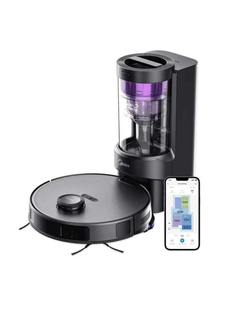 Компактные размеры Midea VCR S10 Plus BL и базы самоочистки облегчают его перемещение и хранение.