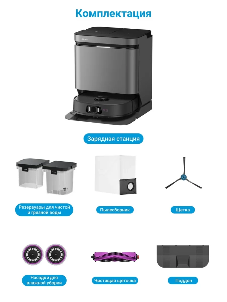 Робот-пылесос имеет станцию самоочистки с 2 резервуарами для чистой и грязной воды объемом 4 и 3.4 литра. Станция самоочистки обеспечивает очистку насадок для влажной уборки, отвод грязной воды, сбор мусора и зарядку аккумулятора, гарантируя полностью автономную работу робота-пылесоса.