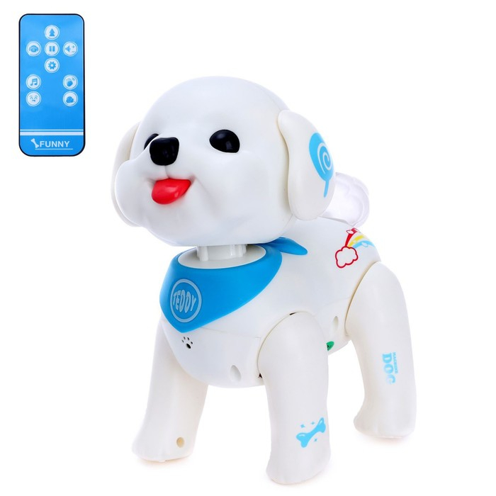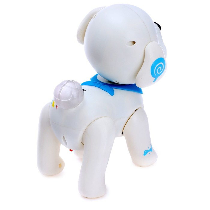 Робот собака Charlie IQ BOT, на пульте управления, интерактивный: звук, свет, танцующий, музыкальный, на батарейках, на русском языке, бело-голубой