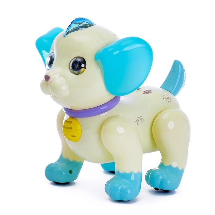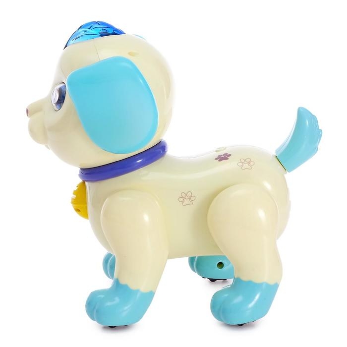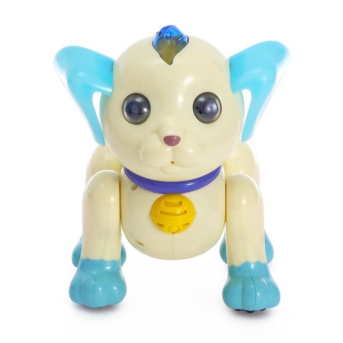 Робот собака Charlie IQ BOT, на пульте управления, интерактивный: звук, свет, танцующий, музыкальный, на батарейках, на русском языке, бело-голубой