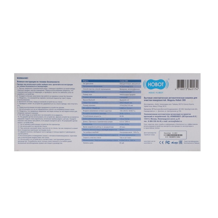 Робот-стеклоочиститель HOBOT-388, 90 Вт, 20 мл, работа 20 мин, 3 режима, 12 салфеток, чёрный