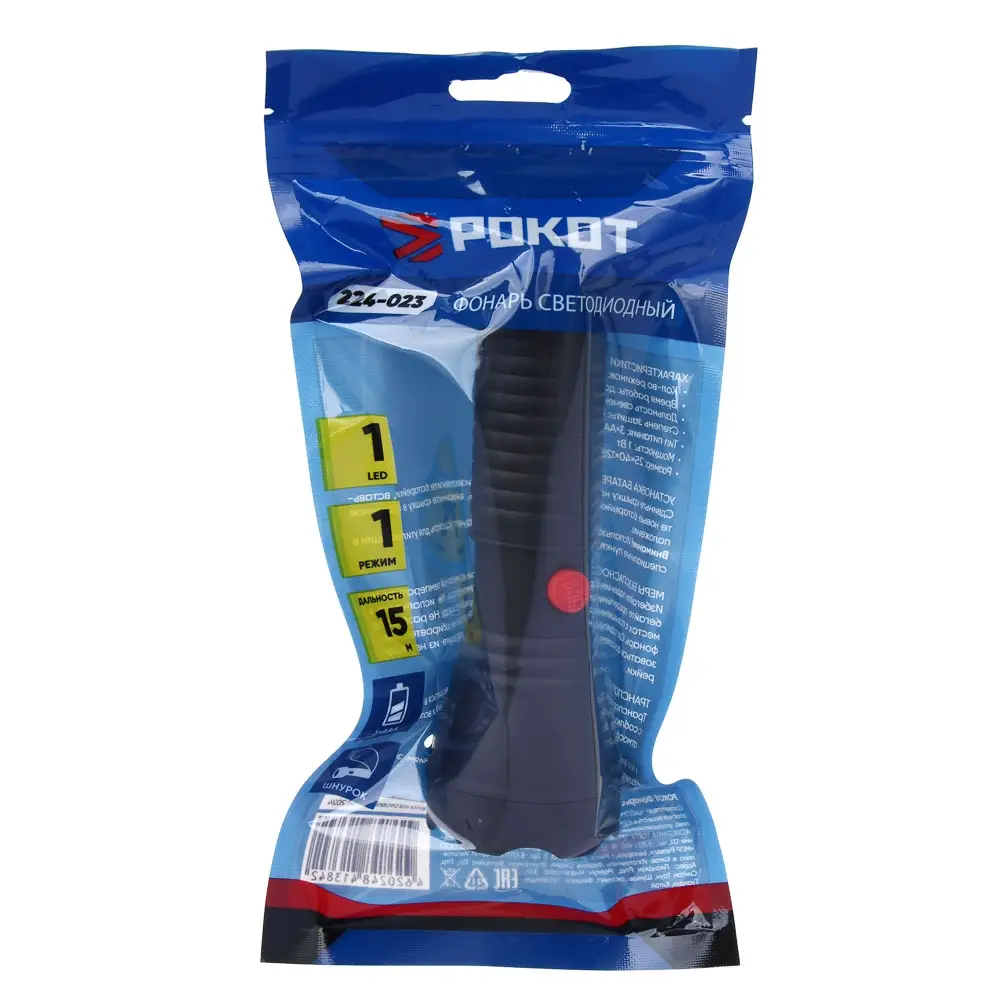 Светодиодный фонарь РОКОТ – ваш надежный источник света на каждый день. Этот компактный и мощный фонарь обеспечит яркое освещение на расстоянии до 15 метров. Он работает от 3 батареек ААА (продаются отдельно), обеспечивая до 8 часов непрерывной работы. Прочный черный корпус с защитой от брызг (IP62) выдержит повседневное использование. Идеально подходит для дома, кемпинга, походов и других активных мероприятий.