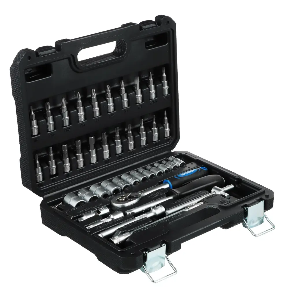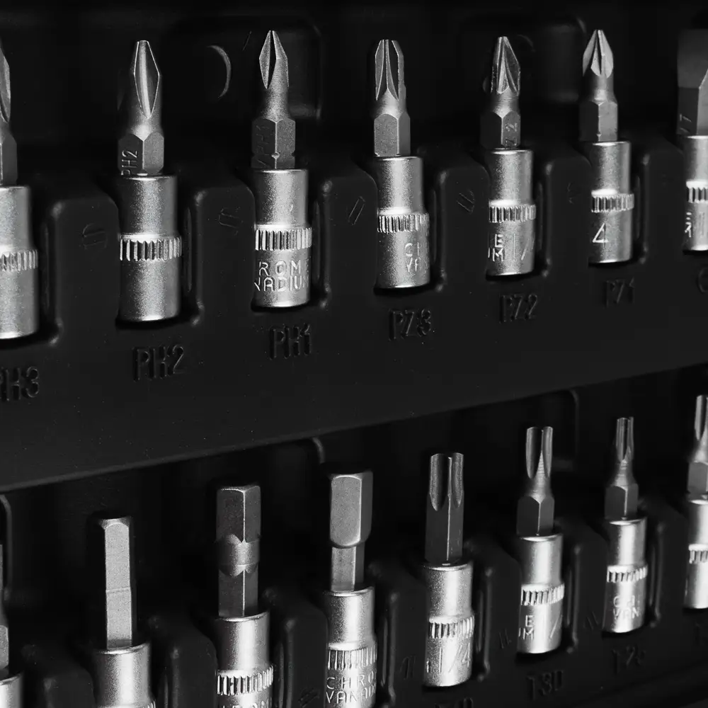 - Вороток Т-образный 1/4" 110 мм; Вороток-отвертка 1/4" 150 мм; Удлинитель 1/4" 2 шт.: 50, 100 мм; Пластиковый кейс; Удлинитель гибкий 1/4" 150 мм; Шарнир карданный 1/4"; Ключи имбусовые HEX 3 шт.: 1.5, 2, 2.5 мм; Головки торцовые 1/4" 13 шт.: 4, 4.5, 5, 5.5, 6, 7, 8, 9, 10, 11, 12, 13, 14 мм; Трещотка с быстрым сбросом 1/4" 45 зубцов; Биты-головки 21 шт.: PH1, PH2, PH3, PZ1, PZ2, PZ3, H3, H4, H5, H6, H7, H8, T10, T15, T20, T25, T30, T40, SL4, SL5.5, SL7; Переходник для торцовых головок 1/4"HEX x 1/4"SQ.