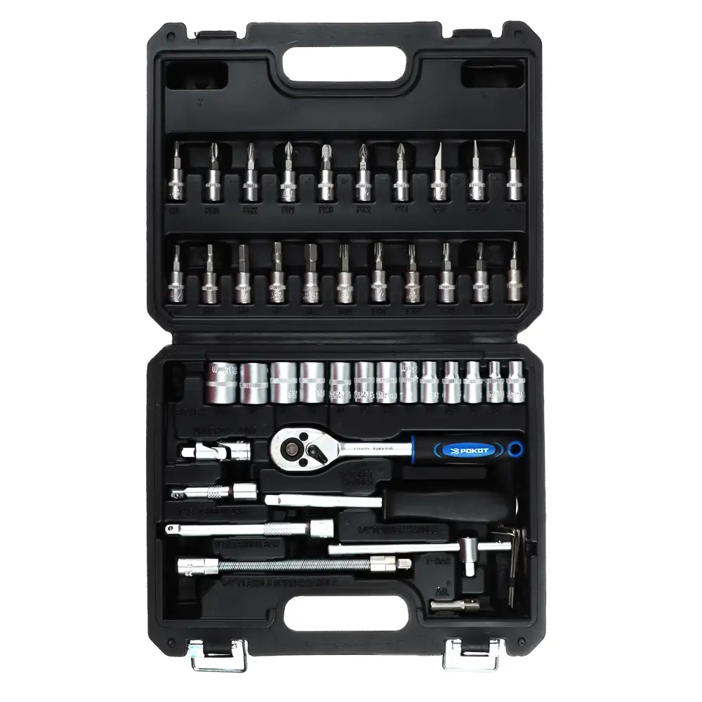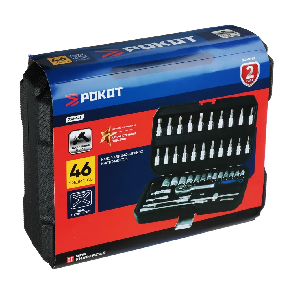 Набор автомобильных инструментов РОКОТ — надежный и практичный комплект, предназначенный для бытовых ремонтных работ и обслуживания автомобиля. Все входящие в комплект принадлежности изготовлены из высококачественной закаленной стали, поэтому надежны в применении. Эргономичные ручки обеспечивают удобный хват во время работы, а пластиковый кейс — компактное хранение 46 предметов и их комфортную транспортировку.