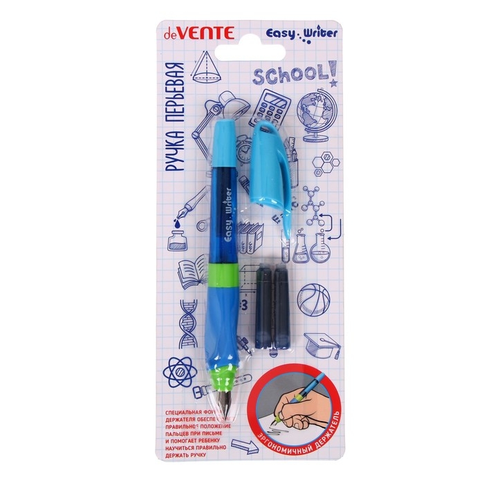 Ручка перьевая "deVENTE. Easy Writer" перо среднее M (Medium) с эргономичным корпусом и резиновым держателем, в комплекте с 2-мя баллончиками 0,8 мл, голубой корпус.