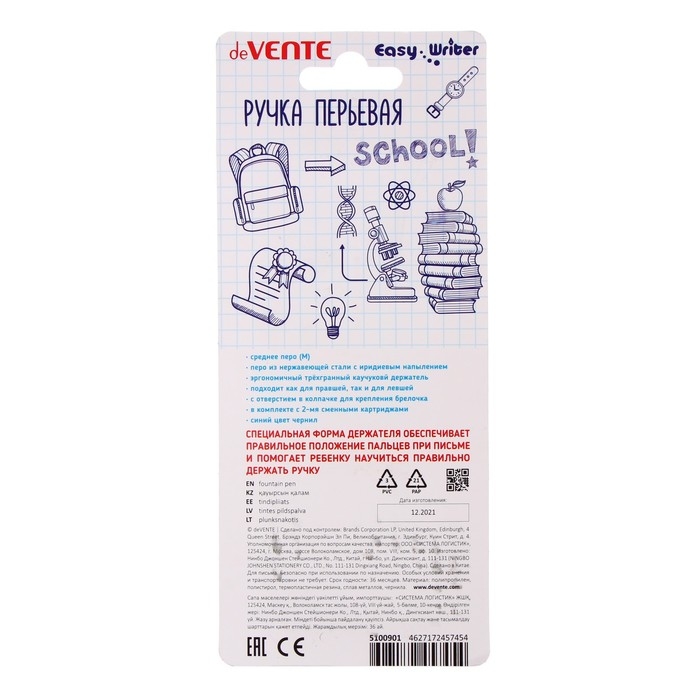 Ручка перьевая deVENTE Easy Writer, размер пера M, 0,8 мм, с 2-мя баллончиками, чернила синие