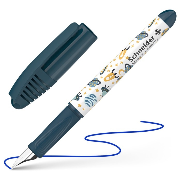 Перьевая ручка Schneider Zippi Space мини-формата специально предназначена для детской руки и послужит прекрасным инструментом для обучения письму. Круглый пластиковый корпус выполнен в стильном космическом дизайне, имеет усиленное стальное перо средней толщины М. В комплекте 1 стандартный картридж с быстросохнущими, ярко-синими чернилами. Ручка одинаково удобна для правшей и левшей. Письменные принадлежности Schneider разрабатываются и производятся только в Германии, их отличают безупречное качество, надежность и экологичность.