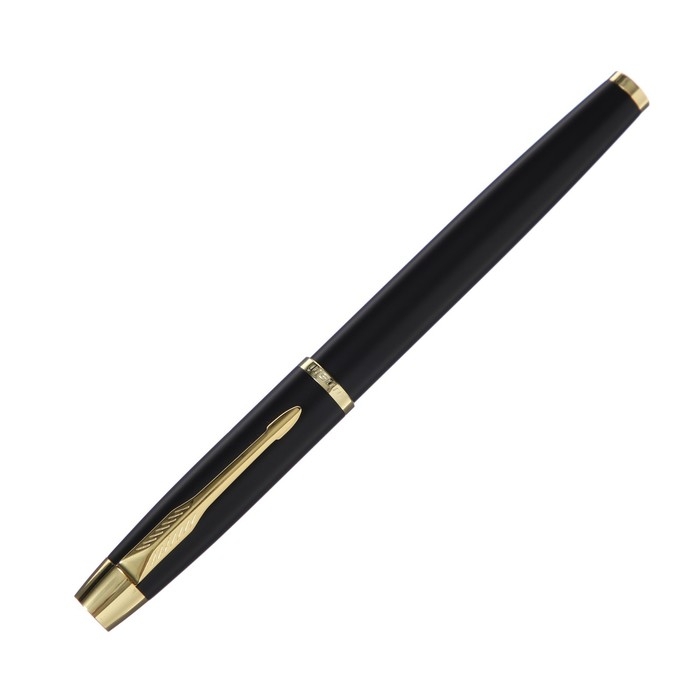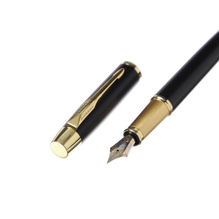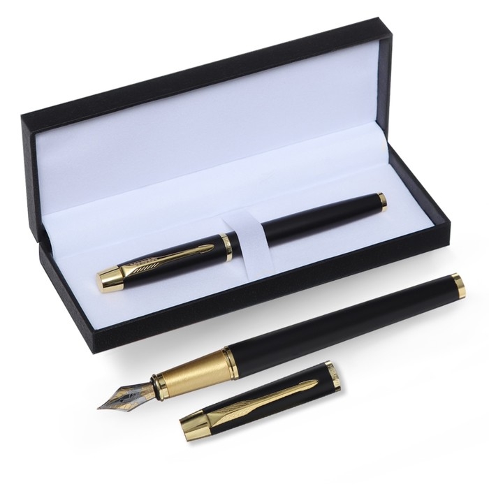 Ручка подарочная перьевая в кожзам футляре, корпус матовый черный, золото