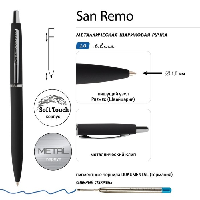 Ручка шариковая автоматическая, 1.0 мм, BrunoVisconti SAN REMO, стержень синий, металлический корпус Soft Touch чёрный, в футляре
