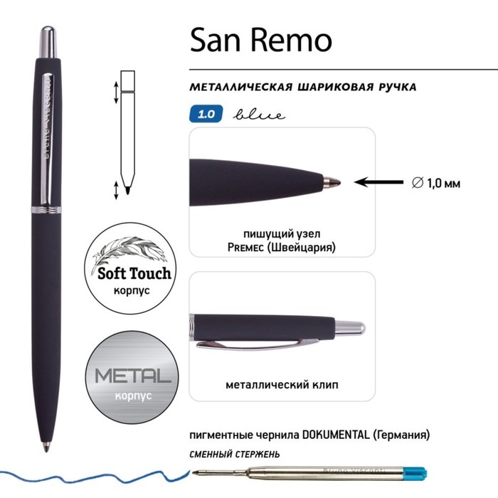 Как и все подарочные ручки Bruno Visconti, San Remo - обладательница стержня пишущим узлом от швейцарского производителя Premec и перманентными чернилами немецкого производителя Dokumental. Поэтому можно быть абсолютно уверенным в качестве письма.