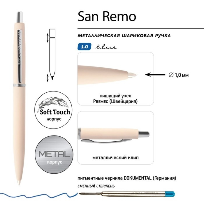 Ручка шариковая автоматическая, 1.0 мм, BrunoVisconti SAN REMO, стержень синий, пудровый металлический корпус Soft Touch, в тубусе