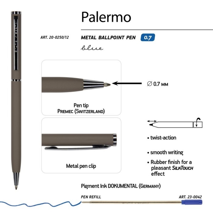 Покрытие корпуса Soft Touch гарантирует дополнительный комфорт в работе с ней. Стержень легко выдвигается благодаря поворотному механизму. Синие пигментные чернила DOKUMENTAL (Германия) и пишущий узел Premec (Швейцария) – обеспечивают качественное и мягкое письмо.