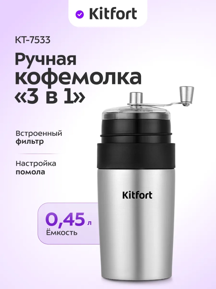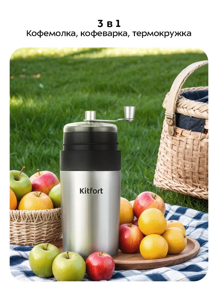 Ручная кофемолка «3 в 1» Kitfort KT-7533 совмещает в себе функцию не только кофемолки, но и капельной кофеварки, а также позволяет брать кофе с собой в термокружке. Кофемолка является ручной, она оснащена коническими жерновами из керамики. Прибор прост в использовании: измельченный кофе попадает в фильтр, после чего его заливают горячей водой, и кофе попадает в термокружку. Термокружку можно закрыть крышкой. В верхней части устройства есть контейнер для зерен, чтобы взять их с собой и заварить кофе из свежемолотых зерен.
