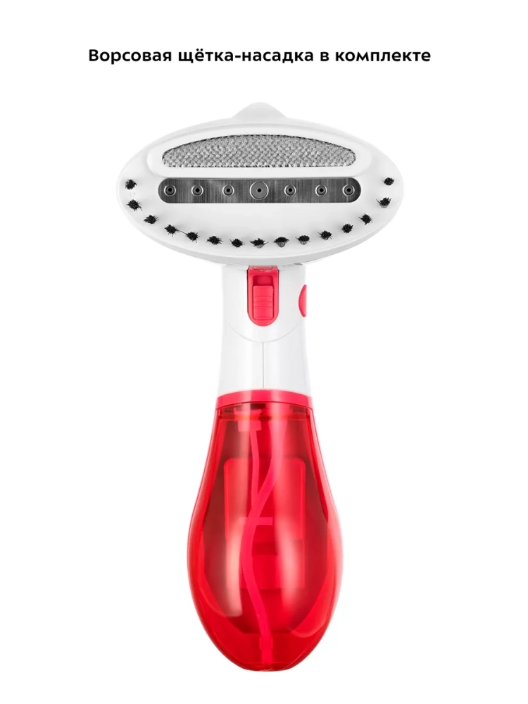 Подача пара в отпаривателе КТ-9192 осуществляется с помощью одной кнопки, которая оснащена фиксатором. Благодаря фиксатору вам не придется удерживать кнопку для непрерывной подачи пара. В комплекте предусмотрена ворсовая насадка, которая поможет очистить вещи от ниток и шерсти домашних животных.