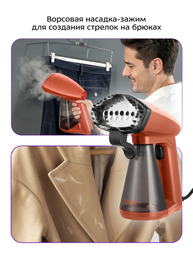 Отпариватель КТ-9291 оснащен тремя уровнями подачи пара для разных типов ткани. Шнур отпаривателя имеет защиту от перегиба, что увеличивает срок службы прибора. В комплекте предусмотрена ворсовая насадка-зажим, которая поможет очистить вещи от пыли, ворса, волос и шерсти домашних животных, а также создать стрелки на брюках.