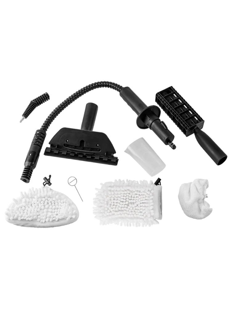 Пароочиститель КТ-9118 предназначен для чистки различных поверхностей, находящихся как внутри, так и вне помещений. Большое количество насадок в комплекте поможет легко отмыть окна, почистить шторы и мягкую мебель. Пароочиститель очищает поверхности от пятен при помощи горячего пара, однако не все пятна могут быть удалены таким способом. В случаях серьезного загрязнения используйте нейлоновую или латунную круглую щетку, а также чистящие средства, которые надо наносить на загрязнения. Для очистки окон, зеркал и кафельной плитки используется насадка с резиновым скребком и тряпку для стекла. Чтобы отпаривать одежду и чистить обивку мягкой мебели в комплекте есть тряпка для отпаривания, которая надевается на насадку с резиновым скребком. Использование прямоугольной насадки с тряпкой для удаления пыли поможет легко избавиться от пыли. Благодаря наличию съемного парового шланга есть возможность добраться и очистить труднодоступные места.