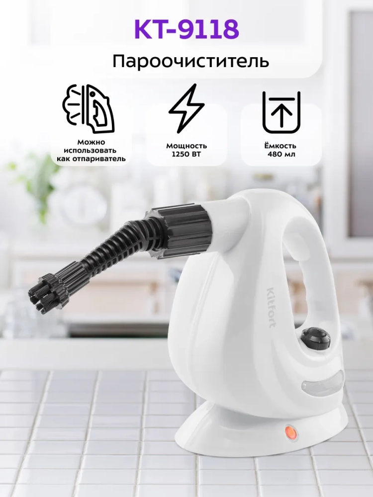 Пароочиститель Kitfort КТ-9118 — многофункциональный прибор, способный заменить дезинфектор, стеклоочиститель и отпариватель. Используя струю горячего пара, пароочиститель отлично очищает поверхности и обеспечивает деликатную глажку вещей. При этом прибор очень удобен в использовании, и работа с ним не требует от пользователя каких-то особых навыков и умений.