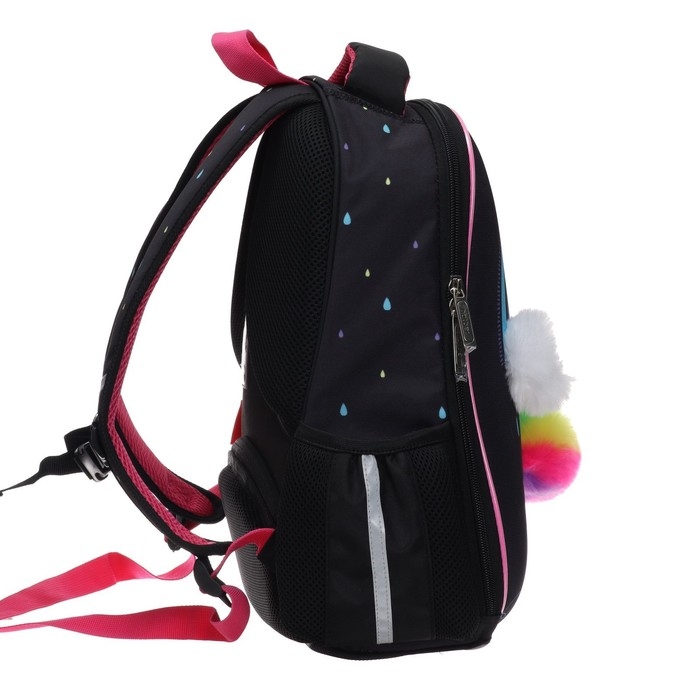 Внутри расположен функциональный органайзер, включающий в себя два кармана на молнии для мелочей и мобильного телефона. Для удобства на задней спинке предусмотрен потайной карман на молнии для ценных вещей. На боковинах – удобные вместительные карманы для бутылки с водой, термоса и других предметов. Дно ранца выполнено из ПВХ и дополнительно оснащено пластиковыми ножками для защиты от загрязнений и влаги. Светоотражающие элементы на лямках, передней и боковой частях ранца обеспечивают безопасность ребенка на дороге.