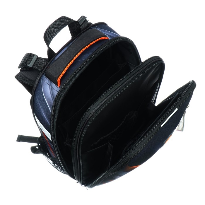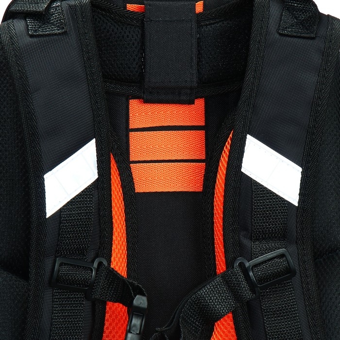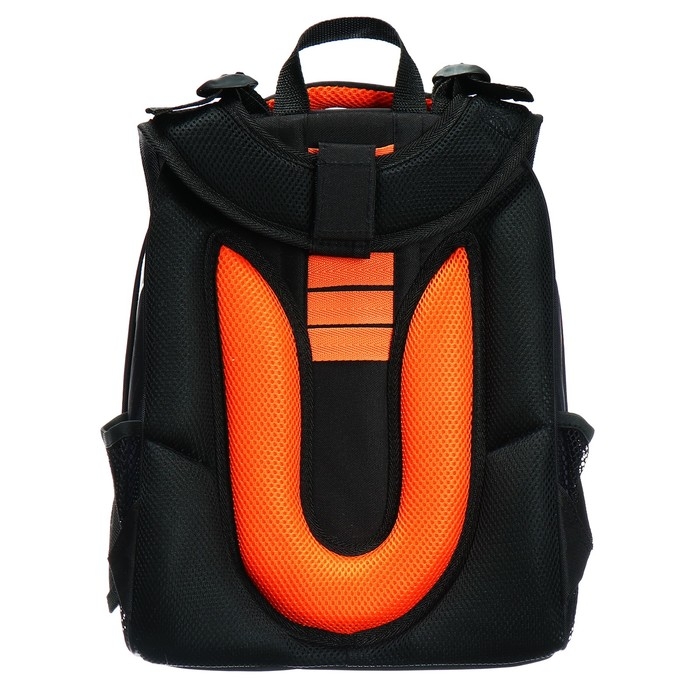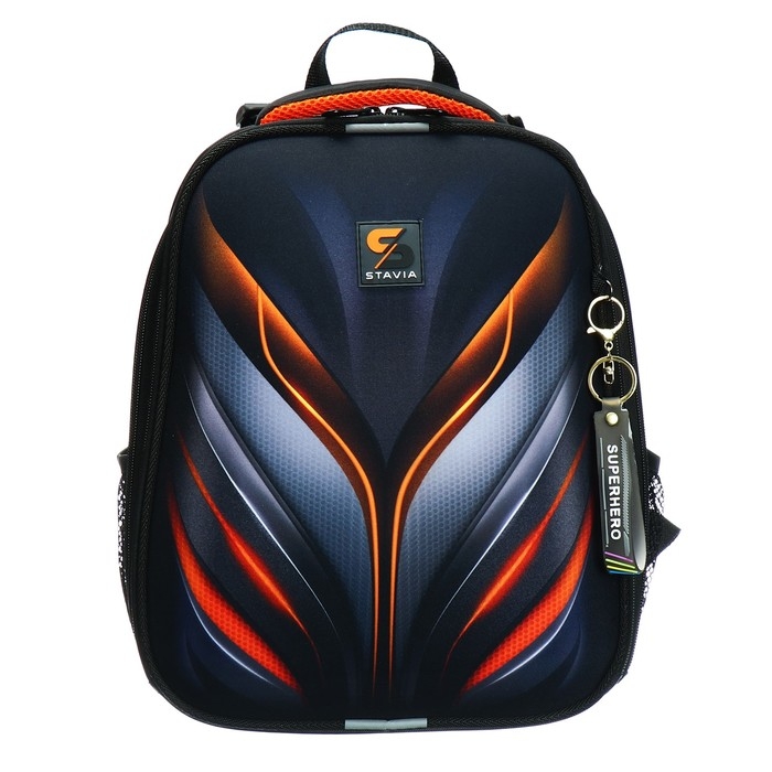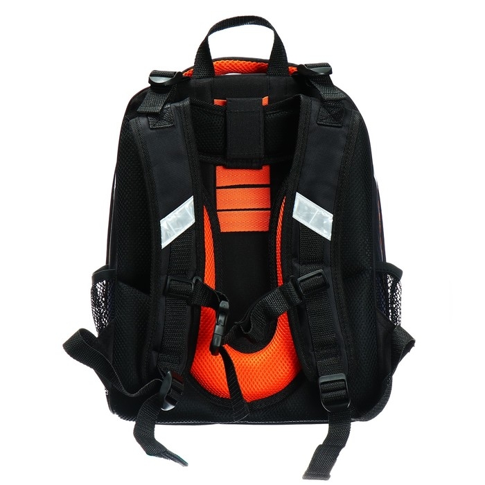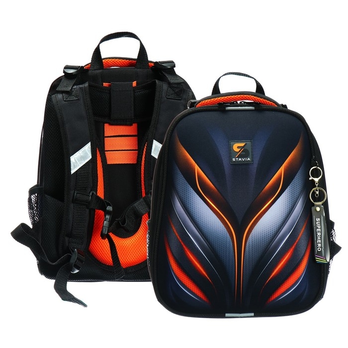 Ранец из формованного EVA-материала и высокопрочного непромокаемого полиэстера. Два вместительных отделения на реверсивной пластиковой молнии; в первом — «плавающие» перегородки для тетрадей и учебников, во втором – большой карман из сетки и карманы-органайзеры. Спинка с анатомическими элементами дополнительно укреплена пластиком, сверху – дышащая трехслойная сетка. Лямки-маечка плотные, мягкие. Регулируются по длине и высоте. Ранец снабжен нагрудным фиксатором и двумя боковыми карманами из прочной сетки. Есть мягкая ручка для переноски и дополнительная петлевая ручка для размещения ранца на крюке. На дне две пластиковые ножки. Ранец имеет светоотражающие элементы на лямках и корпусе. Брелок в комплекте.
