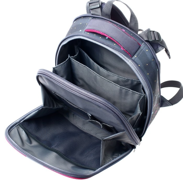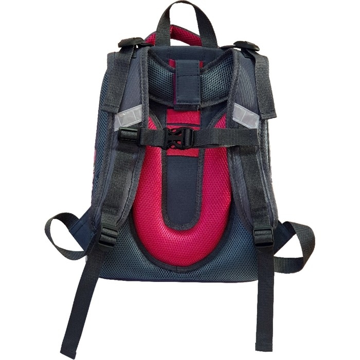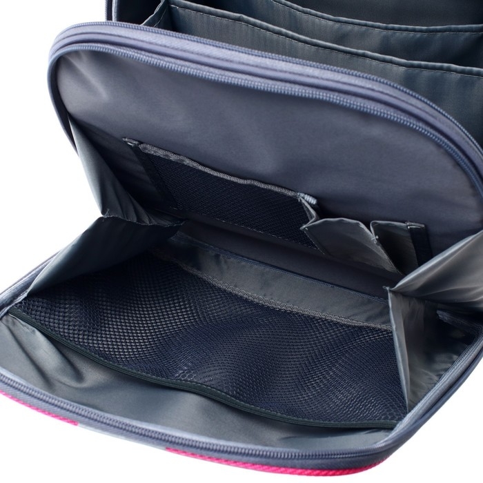 Ранец изготовлен из формованного EVA-материала и высокопрочного непромокаемого полиэстера. Размер 30 х 38 х 16 см. Вес 900 г. Прочные формованные стенки и дно ранца позволяют надежно защитить содержимое от влаги, загрязнений и предотвращают его замятие. Ранец с двумя вместительными отделениями, закрывающимися на реверсивную пластиковую молнию с металлическими «бегунками»; в первом — «плавающие» перегородки для тетрадей и учебников, во втором – большой карман из сетки и карманы-органайзеры для канцелярских принадлежностей. Плотная спинка с анатомическими элементами дополнительно укреплена пластиком, сверху – дышащая трехслойная сетка. Лямки-маечка плотные, мягкие. Регулируются по длине и высоте, что позволяет без труда отрегулировать их по росту ребенка. Ранец снабжен надежным нагрудным фиксатором. Есть удобная мягкая ручка для переноски и дополнительная петлевая ручка для размещения ранца на крюке. На дне ранца есть две пластиковые ножки. В соответствии с требованиями к безопасности на дороге, ранец имеет светоотражающие элементы на лямках и корпусе.
