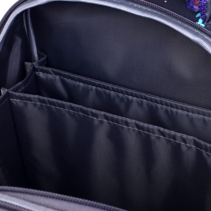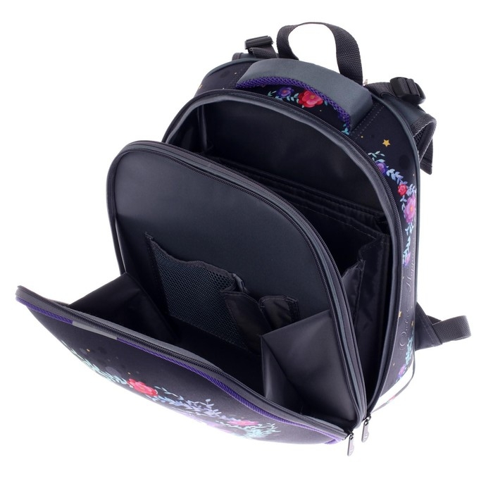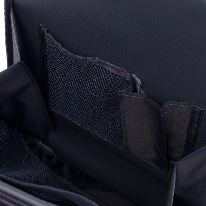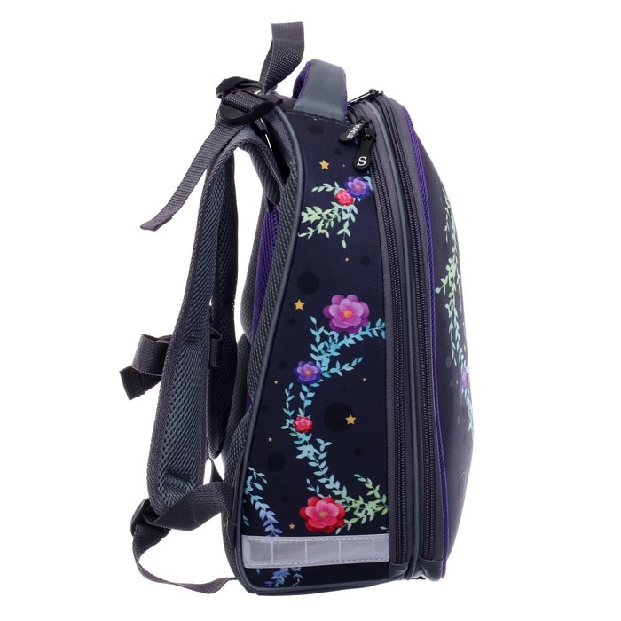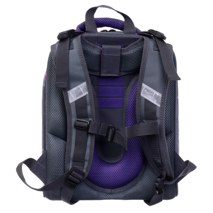 Ранец изготовлен из формованного EVA-материала и высокопрочного непромокаемого полиэстера. Размер 30 х 38 х 16 см. Вес 900 г. Прочные формованные стенки и дно ранца позволяют надежно защитить содержимое от влаги, загрязнений и предотвращают его замятие. Ранец с двумя вместительными отделениями, закрывающимися на реверсивную пластиковую молнию с металлическими «бегунками»; в первом — «плавающие» перегородки для тетрадей и учебников, во втором – большой карман из сетки и карманы-органайзеры для канцелярских принадлежностей. Плотная спинка с анатомическими элементами дополнительно укреплена пластиком, сверху – дышащая трехслойная сетка. Лямки-маечка плотные, мягкие. Регулируются по длине и высоте, что позволяет без труда отрегулировать их по росту ребенка. Ранец снабжен надежным нагрудным фиксатором. Есть удобная мягкая ручка для переноски и дополнительная петлевая ручка для размещения ранца на крюке. На дне ранца есть две пластиковые ножки. В соответствии с требованиями к безопасности на дороге, ранец имеет светоотражающие элементы на лямках и корпусе.