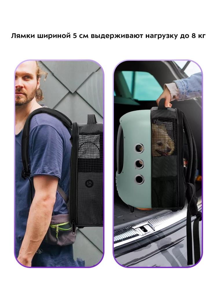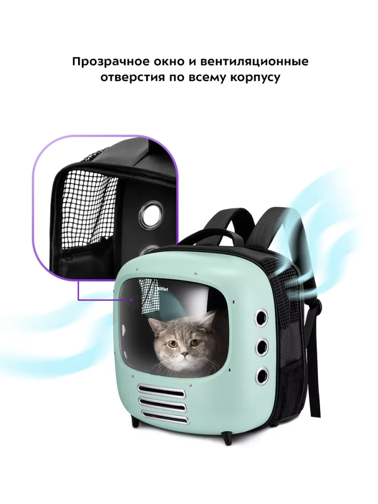 Прозрачное окно позволяет животному видеть окружающую обстановку, что существенно снижает уровень стресса во время дороги. По всему периметру рюкзака-переноски расположены небольшие отверстия для циркуляции воздуха и сетчатые вставки, поэтому внутрь рюкзака-переноски будет постоянно поступать свежий воздух, а животное будет ощущать запахи вокруг, что важно для быстрой адаптации в новом месте.