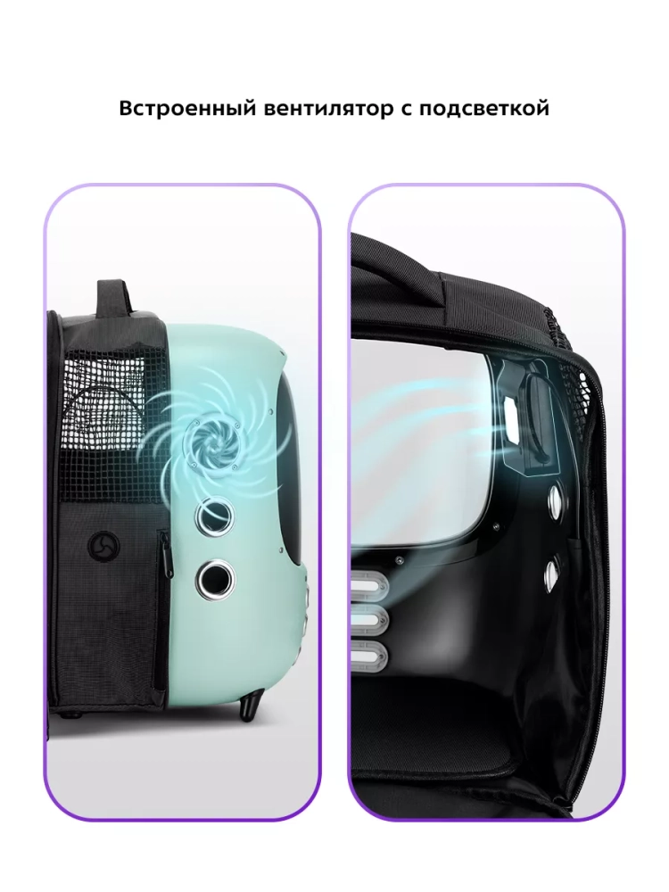Благодаря встроенному вентилятору с мягкой подсветкой вашему любимцу не будет темно и душно внутри рюкзака-переноски. Вентилятор с подсветкой работает от пауэрбанка (не входит в комплект) через USB-шнур. Для пауэрбанка предусмотрен удобный карман снаружи рюкзака. В кармане для пауэрбанка также есть выход для шнура, чтобы вы могли использовать пауэрбанк для зарядки других гаджетов или слушать музыку через наушники во время прогулки.