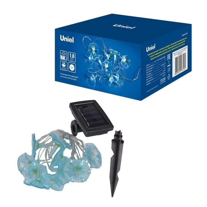 Садовая гирлянда на солнечной батарее «Вьюнок» USL-S-136/PT2000 GLORYBIND предназначена для декоративной подсветки сада — для беседок, деревьев, кустов. Комплект представляет собой светильники в форме цветков вьюнка, соединенные общим проводом. Солнечная панель устанавливается в землю с помощью колышка (в комплекте). В гирлянде используются светодиоды (10 шт). Два режима свечения: постоянное и мигание, цвет свечения — белый. Световой поток 5 лм. Срок службы - до 50000 часов. Гирлянда изготовлена из пластика, цвет провода — прозрачный, степень пылевлагозащиты IP44. Диапазон рабочих температур - от -20 до +40 °С. Подключение к электросети не требуется. Гирлянда оборудована солнечной панелью. Заряжается в светлое время суток. Емкость аккумуляторной батареи 600 мАч. Выключатель расположен на корпусе солнечной панели. Длина гирлянды 1.8 м, длина провода 2 м. Габариты изделия - ДхШхВ 1800х100х180 мм. Размер упаковки - ДхШхВ 125х125х170 мм. Общий вес комплекта 293 г