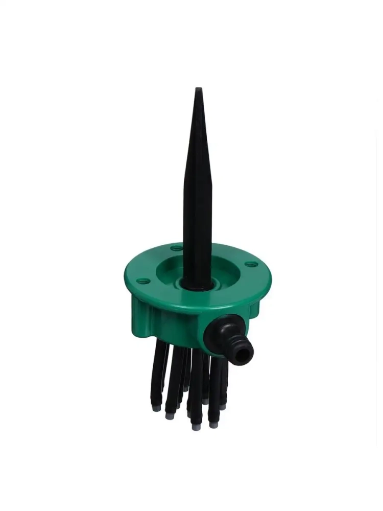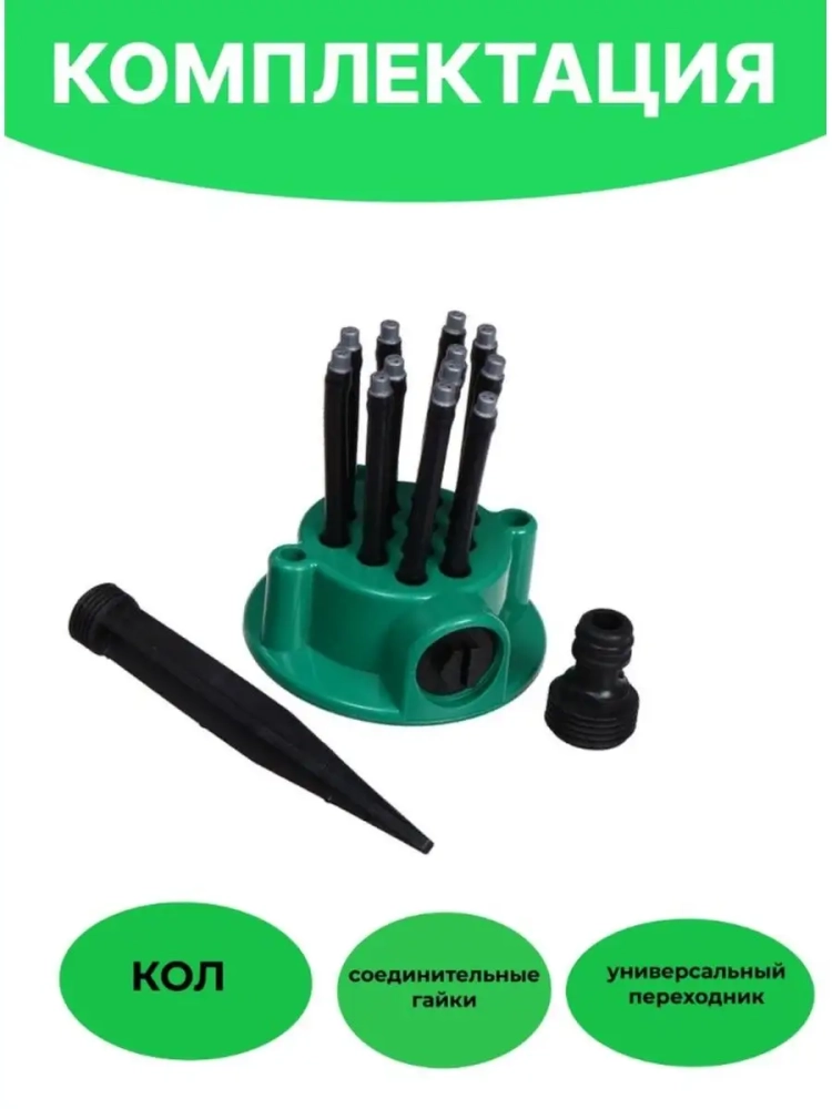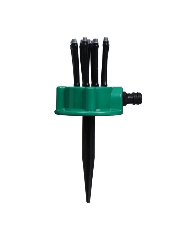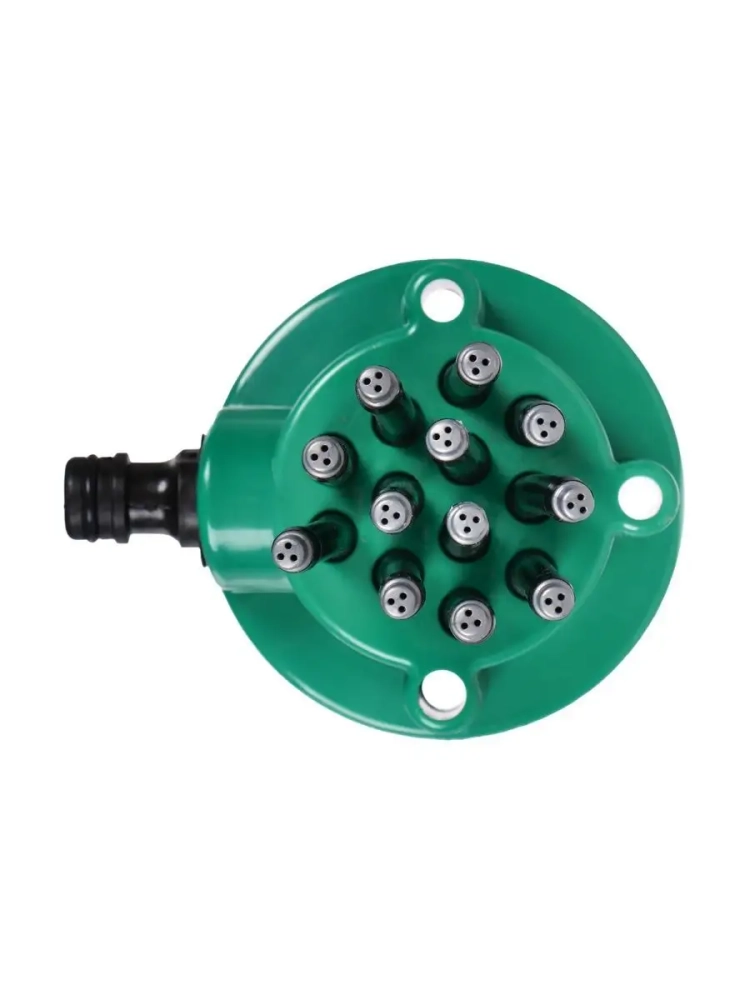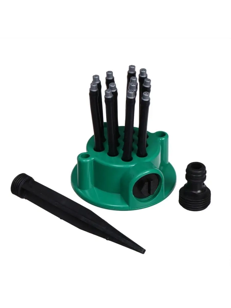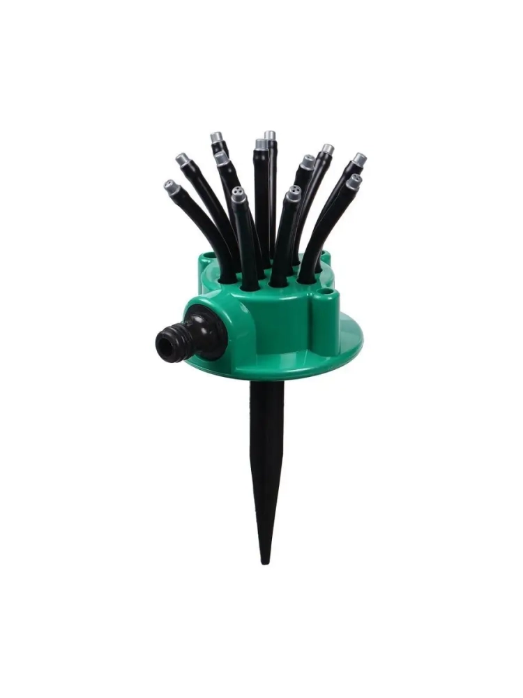 Распылитель-дождеватель, 12 форсунок, под коннектор, пика, пластик. С насадкой процесс поливки станет комфортнее. Изделие выполнено из пластика. Диск легко снимается и чистится. Подача воды по типу мелкого дождя отлично подойдёт для орошения водой нежных растений и цветов. Полив станет удобнее и приятнее! Для ручного полива растений создана специальная насадка. Для нее не обязательно монтировать систему орошения, достаточно лишь одного шланга. Такая лейка рассеивает струю воды и бережно поливает растения. Благодаря ребристой ручке вам будет удобно пользоваться поливалкой: она не выскользнет из рук и не будет произвольно двигаться. Поливочный шланг также используется для уборки дома, мытья окон и автомобилей, полива питомников, опрыскивания или подкормки растений. Кроме того, пистолет-распылитель можно использовать как насадку для дачного душа. Такое устройство понадобится для эффективного полива Ваших грядок, газона или клумбы. Решает проблему неравномерного полива, делает зелень растений более насыщенной и сочной. Обычным шлангом довольно сложно обеспечить участку равномерный умеренный полив, к тому же, это займет много времени и сил. Спринклерный ороситель является насадкой на шланг, такое нехитрое и недорогое приспособление освободит Вас от рутинной работы.Принцип устройства основан на том, что поток воды из шланга расщепляется на множество более мелких струек, которые направлены в разные стороны. Равномерность распределения воды по участку предотвращает усыхание/загнивание растений в разных местах участка. Передвигайте разбрызгиватель с подсоединенным шлангом, чтобы полить следующую часть лужайки и грядки.12 небольших шлангов направляют воду во все стороны, в том числе вверх, захватывая, таким образом, и высокие растения. Дальность полива зависит от интенсивности напора.