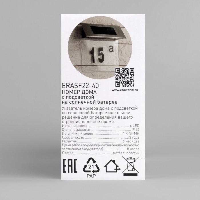 Благодаря подсвечиваемой номерной табличке с удобными креплениями на фасад здания, ваш участок приобретёт завершённый гостеприимный вид. В ассортименте ЭРА несколько указателей номера дома с подсветкой на солнечной батарее: ERAFS048-09 (арт. Б0044249), ERASF22-40 (арт. Б0053390). Светодиодный номер дома станет идеальным решением для определения вашего строения в ночное время. Светящийся номерной знак на дом защищен от воздействия осадков - IP44. Светодиодные номерные таблички от ЭРА не требуют вывода провода и подключения к электросети, поэтому монтируются быстро и в любом удобном месте на фасаде дома. В светлое время суток подзаряжаются, а с наступлением сумерек автоматически включаются, ярко подсвечивая номер вашего дома или дачи современными светодиодами. Стоит также отметить, что цифры и буквы к таким фасадным светильникам торговой марки ЭРА поставляются в комплекте. Вы получаете готовое решение, которое будет ещё до порога дома характеризовать вашу семью как гостеприимную и ценящуюю комфорт. Светильники и гирлянды ЭРА на солнечных батареях - экологически чистый и экономичный тип освещения. Их оценят и молодые люди, стремящиеся придерживаться экотрендов, и пенсионеры, внимательно