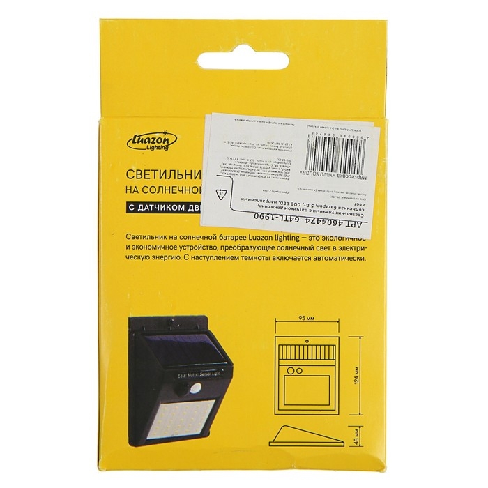 Садовый светильник на солнечной батарее с датчиком движения, накладной, 9.5 × 13 × 5 см, 49 LED, свечение белое