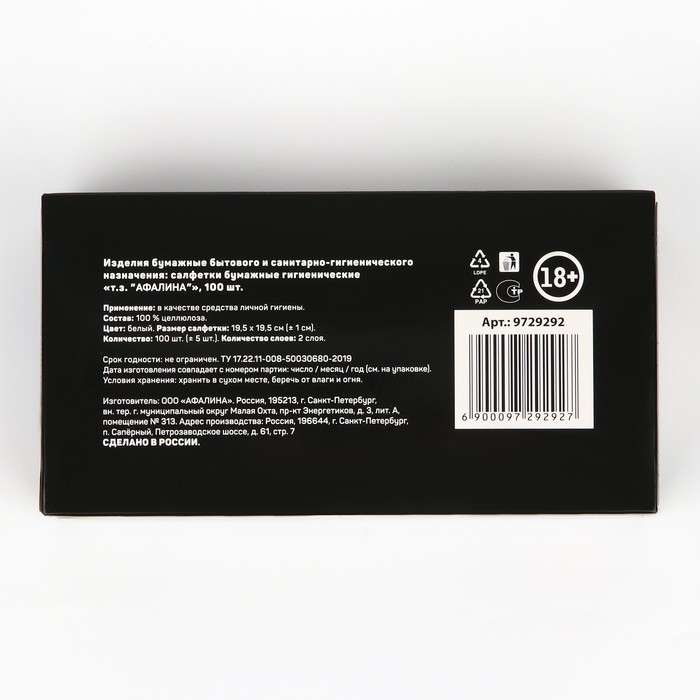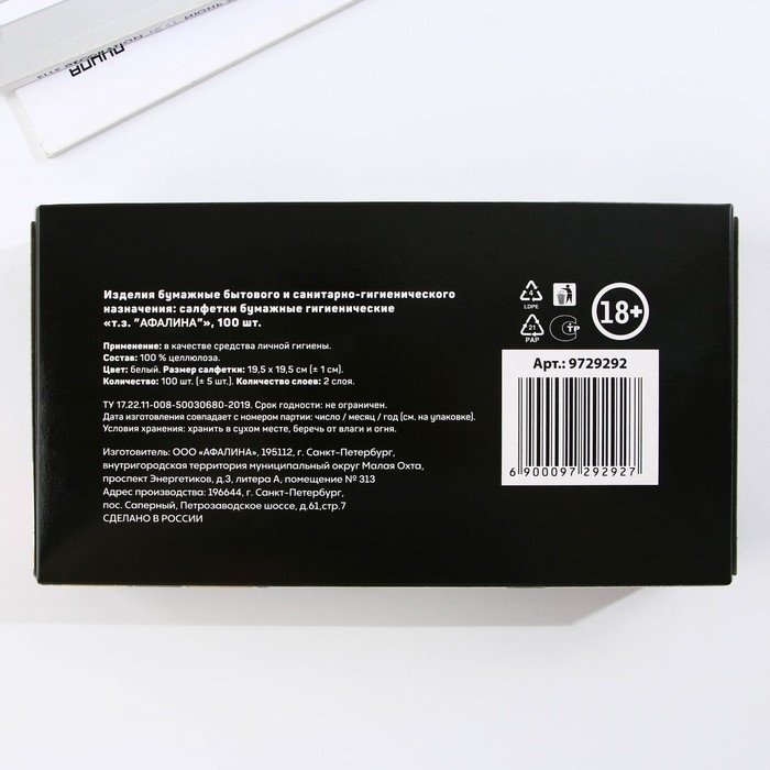 В упаковке 100 сухих бумажных двуслойных салфеток размером 20 х 20 см.