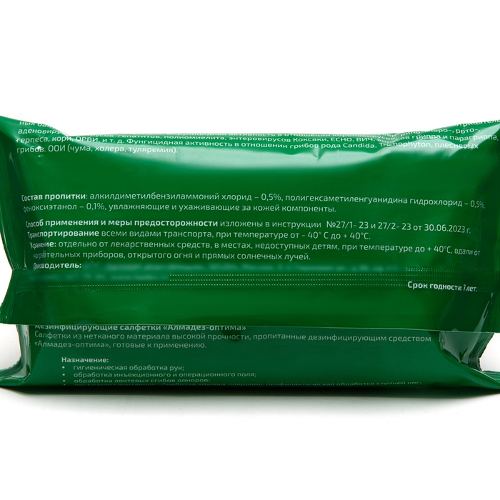 Салфетки влажные Алмадез-Оптима - это медицинское изделие, предназначенное для очистки и дезинфекции кожи. Они изготовлены из мягкого нетканого материала, который не вызывает раздражения и аллергических реакций.