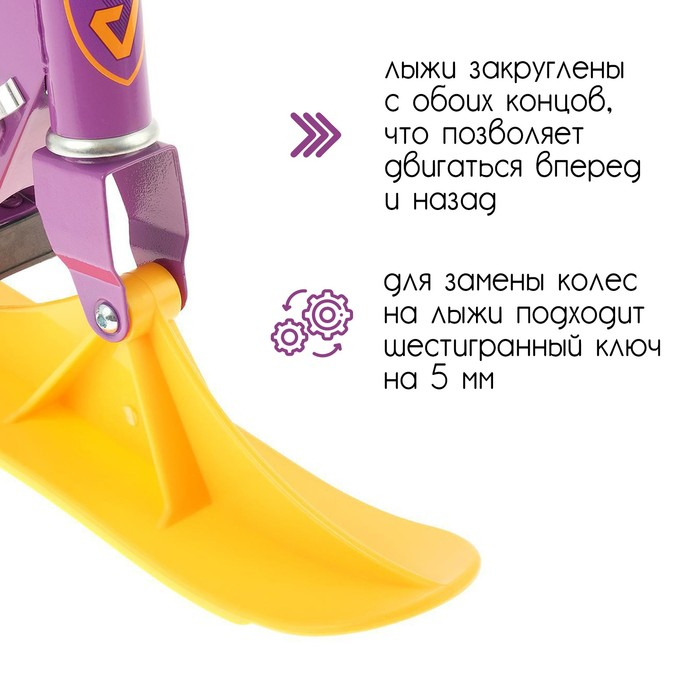 Самокат-снегокат актуален зимой и летом. На колёсах можно кататься по любым ровным поверхностям в сухое время года, зимой — на лыжах по снегу.