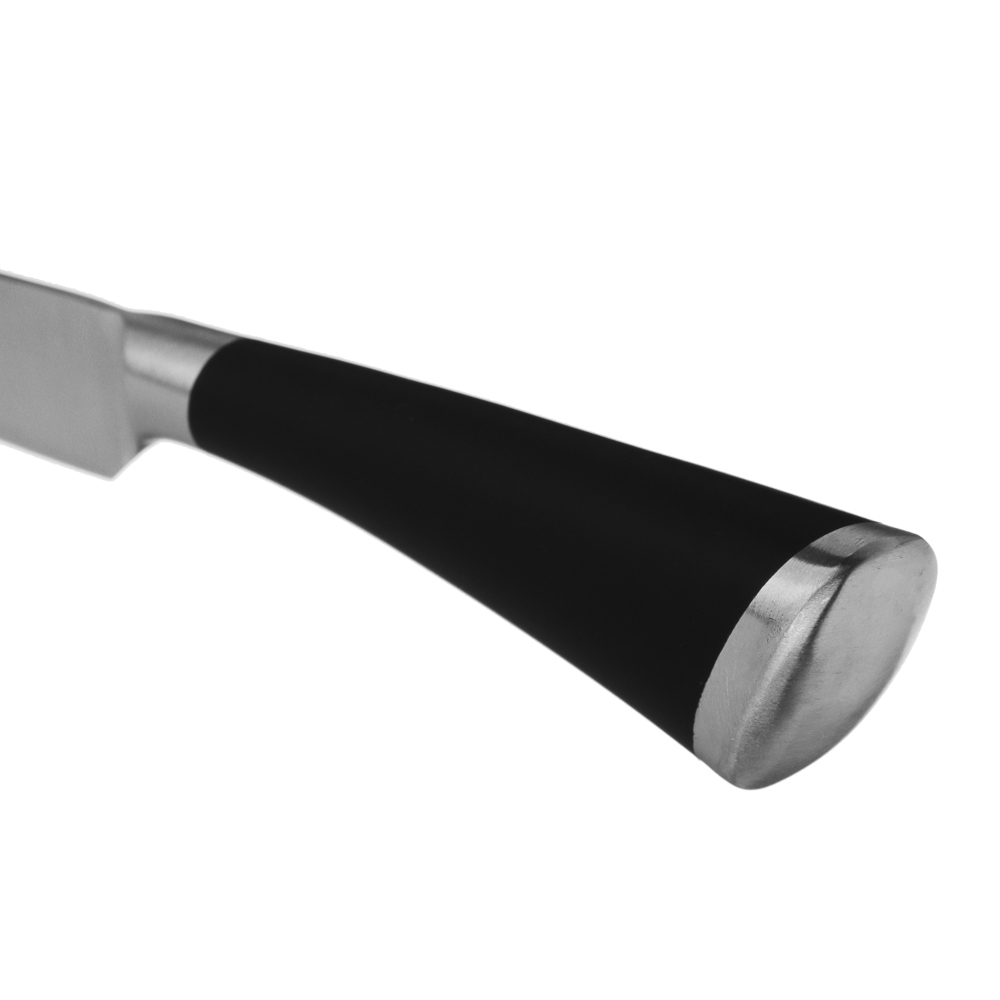 Идеальный выбор для любителей домашней кухни - овощной кухонный нож SATOSHI Акита с длиной лезвия 8 см. Маленький нож удобен для нарезки и чистки овощей и фруктов от кожуры. Рукоять с покрытием софт-тач удобно фиксируется в руке, не выскальзывая в процессе использования. Сталь долго держит заточку, не боится коррозии. Имеет строгий стильный дизайн.