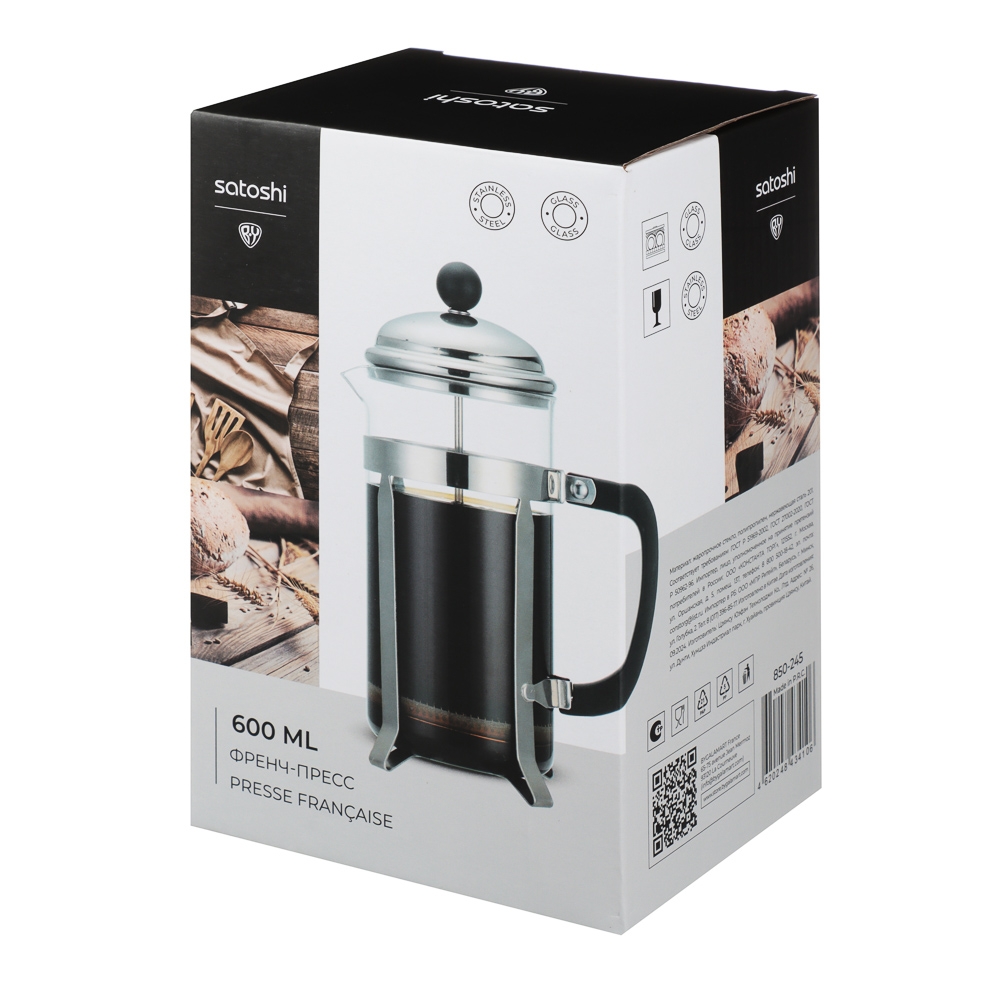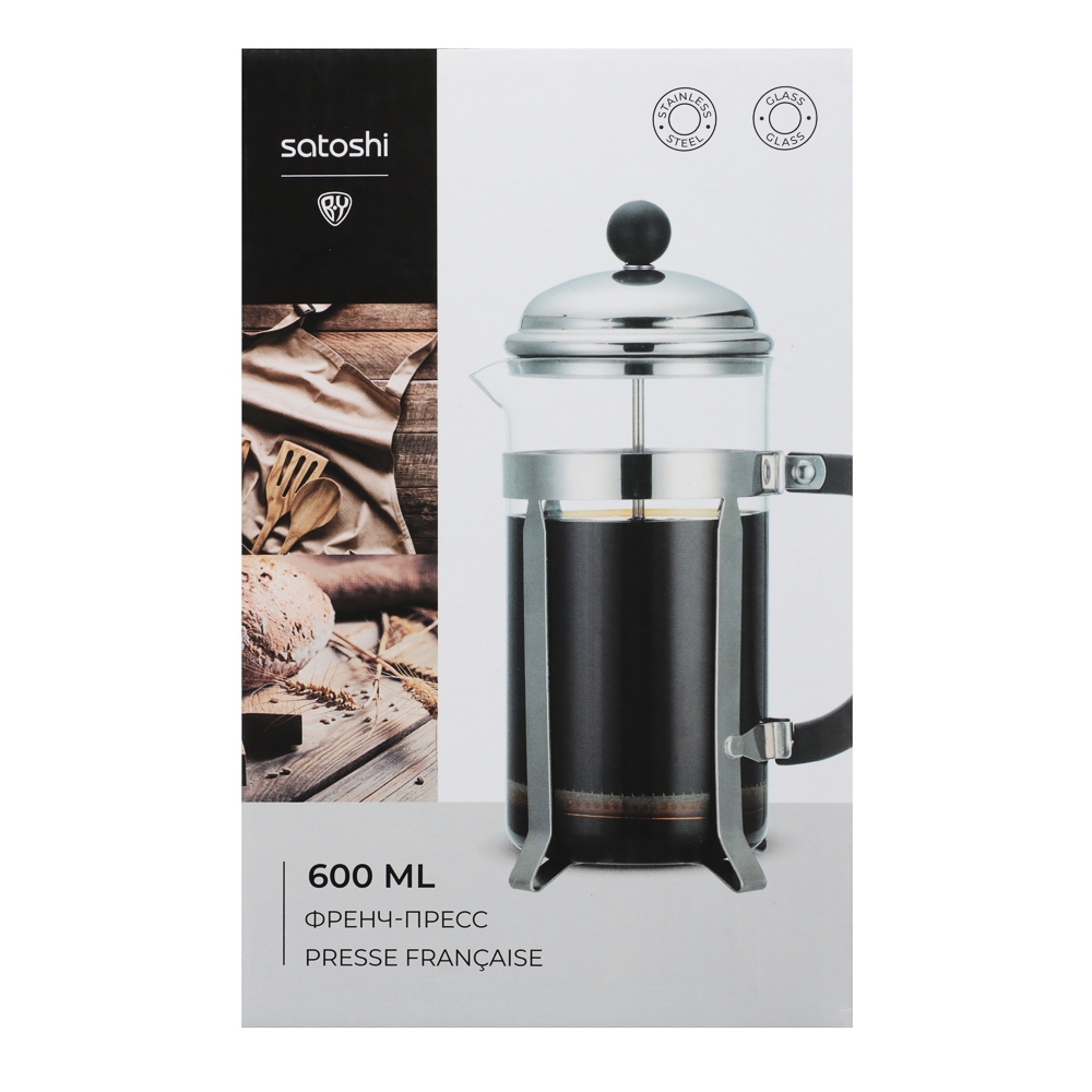 Френч-пресс SATOSHI «Бордо» объемом 600 мл из жаропрочного стекла – это качественный и удобный заварочный чайник на каждый день. Подходит для приготовления кофе или чая. Оснащен подставкой, которая позволяет поставить френч-пресс на стол без использования подставки под горячее, а также ненагревающейся ручкой. Поршень из нержавеющей стали не подвержен коррозии и не искажает вкус напитка. Фильтр эффективно задерживает мелкие частицы, поэтому готовый напиток будет чистым и прозрачным.