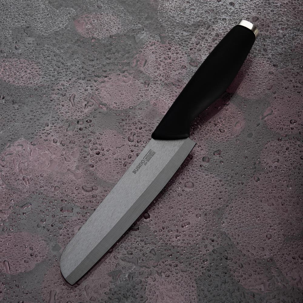 Керамический кухонный нож 15 см SATOSHI Бусидо удивит вас удобством и точностью нарезки. Керамическое лезвие не нуждается в частой заточке. Материал не вступает в реакцию со щелочами и кислотами, не боится ржавчины и надолго сохраняет опрятный внешний вид. Керамический кухонный нож порадует отличной остротой и качеством работы. Изделие не придает продуктам металлического привкуса и легко затачивается камнем с алмазным напылением. Эргономичная рукоятка удобно ложится в руке и обеспечивает комфортное использование аксессуара.